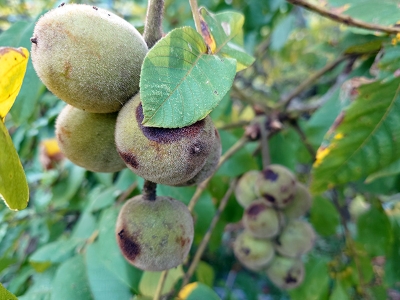 暑い夏を越え、空気が涼しくなってくる頃、くるみは一気に熟し始めます。月になると、外側の果皮が茶色くなる部分が増えます。これは、内部の実が成熟している証です。