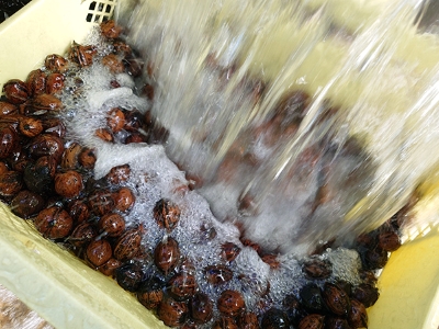 その後、小川に持っていき、水の流れを利用しながら、細かいところまで果皮をざぶざぶと洗い落としていきます